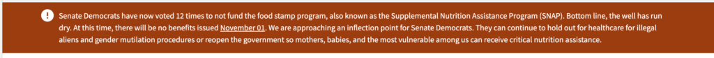 “Senate Democrats have now voted 12 times to not fund the food stamp program, also known as the Supplemental Nutrition Assistance Program (SNAP). Bottom line, the well has run dry. At this time, there will be no benefits issued November 01. We are approaching an inflection point for Senate Democrats. They can continue to hold out for healthcare for illegal aliens and gender mutilation procedures or reopen the government so mothers, babies, and the most vulnerable among us can receive critical nutrition assistance.”