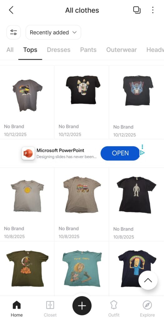 I have all my hats and a small subsection of my t-shirts, a few sweaters, and a few pairs of pants in it so far. I wanted to just catalog all my 100+ t-shirts, but I dig the idea of adding everything. That, however, is going to take me some time to do.